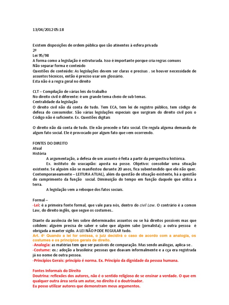 Temos, portanto, a analogia, os costumes e os princípios gerais de direito como fontes subsidiárias, e a lei jurídica como principal fonte formal do nosso direito. Podemos conceituá-la como.