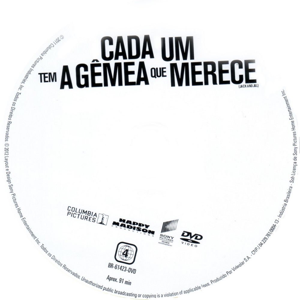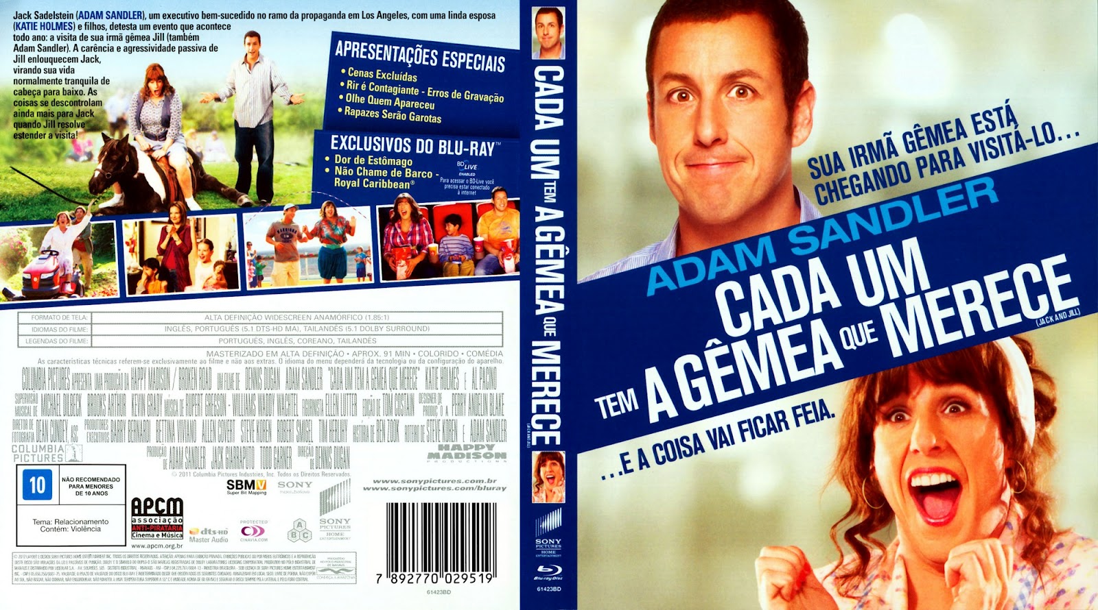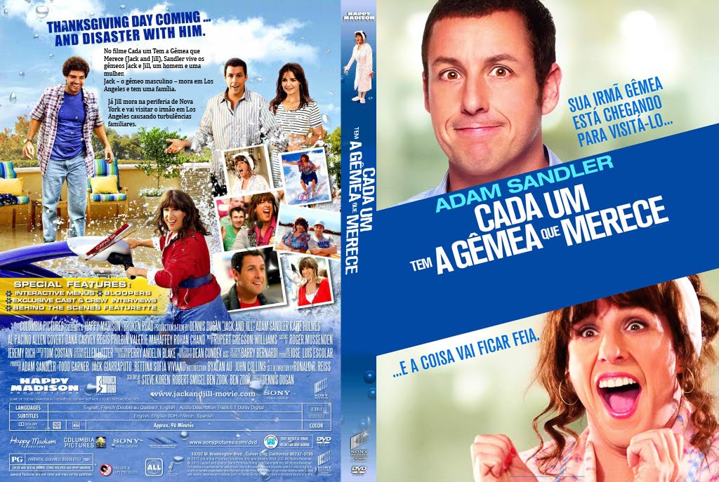 Cada Um Tem a Gêmea Que Merece. Em "Cada um Tem a Gêmea que Merece", Sandler vive os gêmeos Jack e Jill, um homem e uma mulher. Jack, o gêmeo masculino, mora em Los Angeles e tem uma família. Já Jill mora na periferia de Nova York e vai visitar o irmão em Los Angeles causando turbulências familiares. IMDb 3,3 1h 27min 2011.