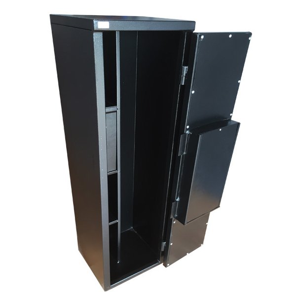 Cofre Digital Eletrônico para Armas e Munições Safe Gun Aprovado pelo Exército Medidas externas (A x L x P): 155 cm x 50 cm x 47 cm Altura do piso até os suportes de apoio às armas: 104 cm Possui divisão na parte de cima (prateleira) e espaços na porta para melhor organização dos objetos. Altura da prateleira até o teto: 25 cm