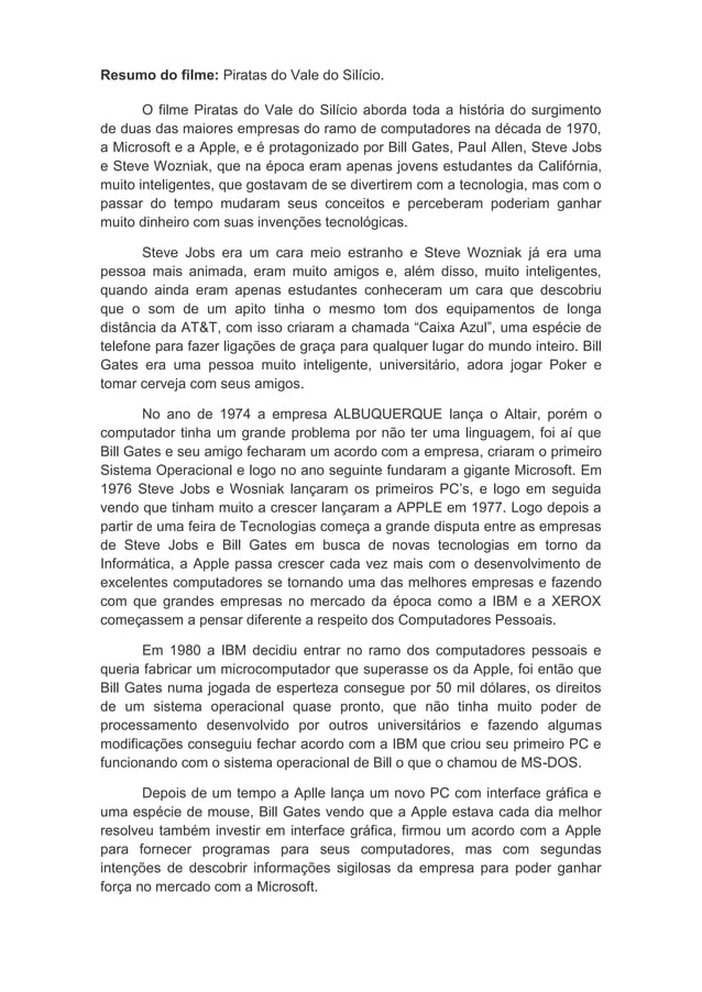 Resenha: Resumo do filme " Piratas do Vale do Silício". Pesquise 860.000+ trabalhos acadêmicos. O filme fala sobre como surgiu às empresas Microsoft e Apple na década de 70, através de quatro jovens universitários que adoram informática: Bill Gates, Paul Allen, Steve Jobs e Steve Wozniak. Com toda inteligência e esperteza ao longo.