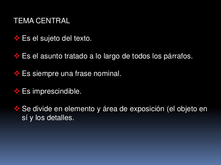 hechos, ideas, anécdotas o detalles que integran el texto adquieren sentido al relacionarlos con el tema central o principal. En los textos literarios, es importante distinguir entre argumento y tema1. Para entenderlo, analizaremos este pequeño fragmento narrativo: Las bellas manos que cortaban las flores del huerto han desaparecido ya hace.