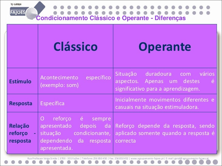 Vejamos quais são as principais diferenças entre condicionamento clássico e operante: Princípios gerais: o condicionamento clássico é um tipo de aprendizagem que generaliza a associação entre dois estímulos, isto é, um indica a aparição do outro.Por outro lado, o condicionamento operante afirma que os organismos vivos aprendem a se comportar de uma maneira particular devido às.