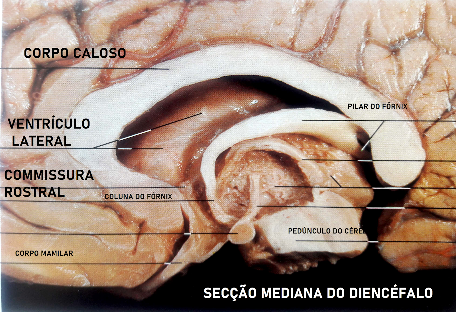 Diencéfalo corresponde à parte mais central do encéfalo. O corpo caloso não faz paste do diencéfalo, pois são fibras de associação do telencéfalo. No rostro do corpo caloso existe um afunilamento que forma a lâmina do rostro do corpo caloso e dessa lâmina para baixo inicia-se o diencéfalo.. na parte lateral (que é a maior e mais.
